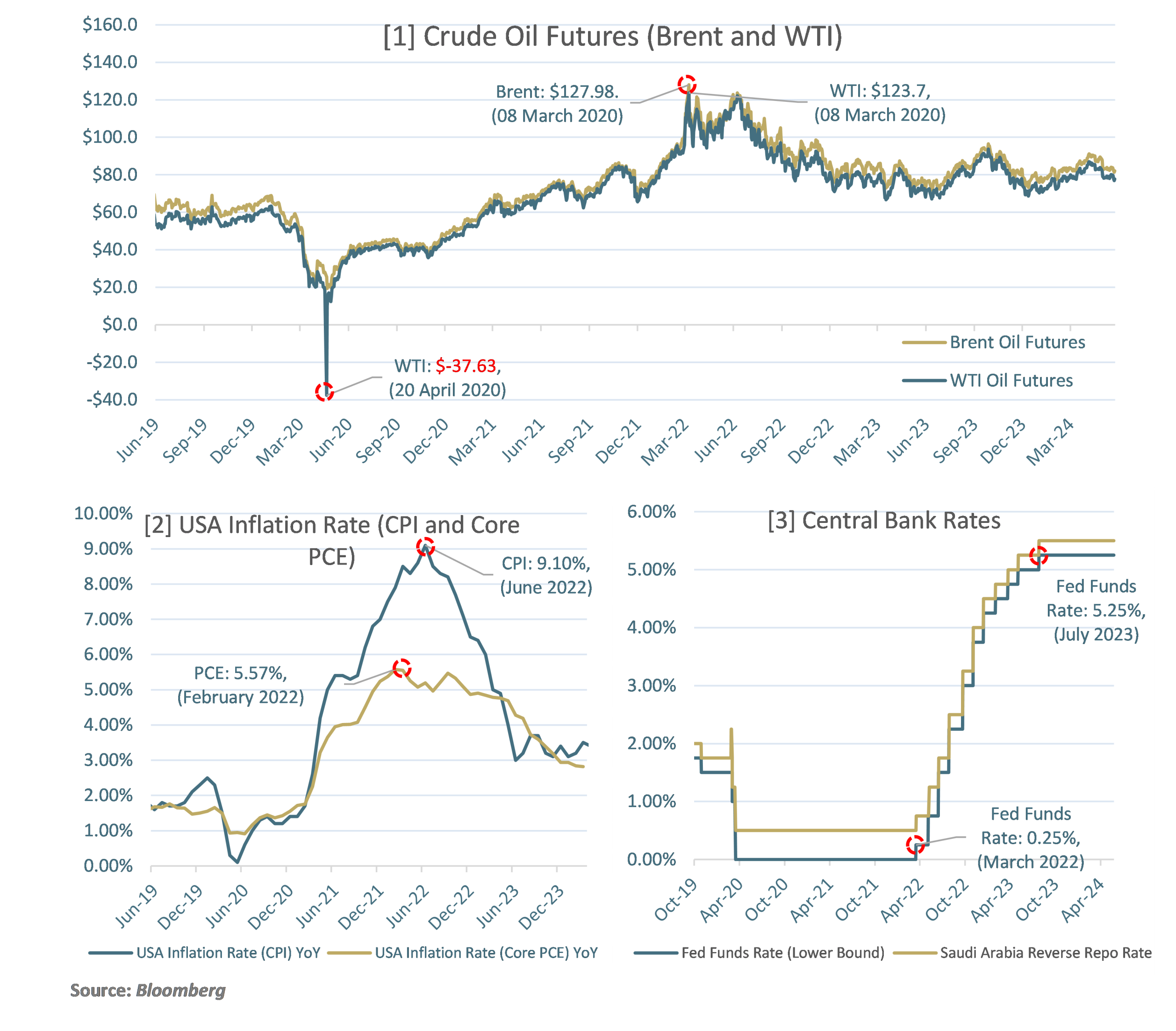 The charts above demonstrate certain instances of market-wide risks in recent times. Chart [1] displays the prices of crude oil futures over the last five years. On April 20, 2020, soon after the outbreak of the COVID-19 pandemic, WTI futures fell to -USD 37.63 due to oversupply and a lack of storage capacity. Subsequently, WTI and Brent futures increased to their highest levels in 10 years as concerns over crude supply escalated due to the Russia-Ukraine conflict. Rising prices for crude and other commodities contributed to decades-high inflation, as can be seen in chart [2]. The annual inflation rate, measured through indicators like the Consumer Price Index (CPI) and the Core Personal Consumption Expenditures (PCE) Index (the Federal Reserve’s preferred gauge of inflation in the U.S.), reached highs of 9.10% and 5.57% in June 2022 and February 2022, respectively. To combat these rising inflationary pressures, the Fed began hiking rates in March 2022, continuing through July 2023, raising them from 0% prior to the hikes to the target range of 5.25%-5.50%, as can be seen in chart [3].